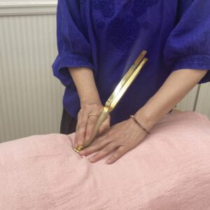 128Hzち295・8Hzの深い音叉の振動を直接身体にあてて、マッサージしていきます。